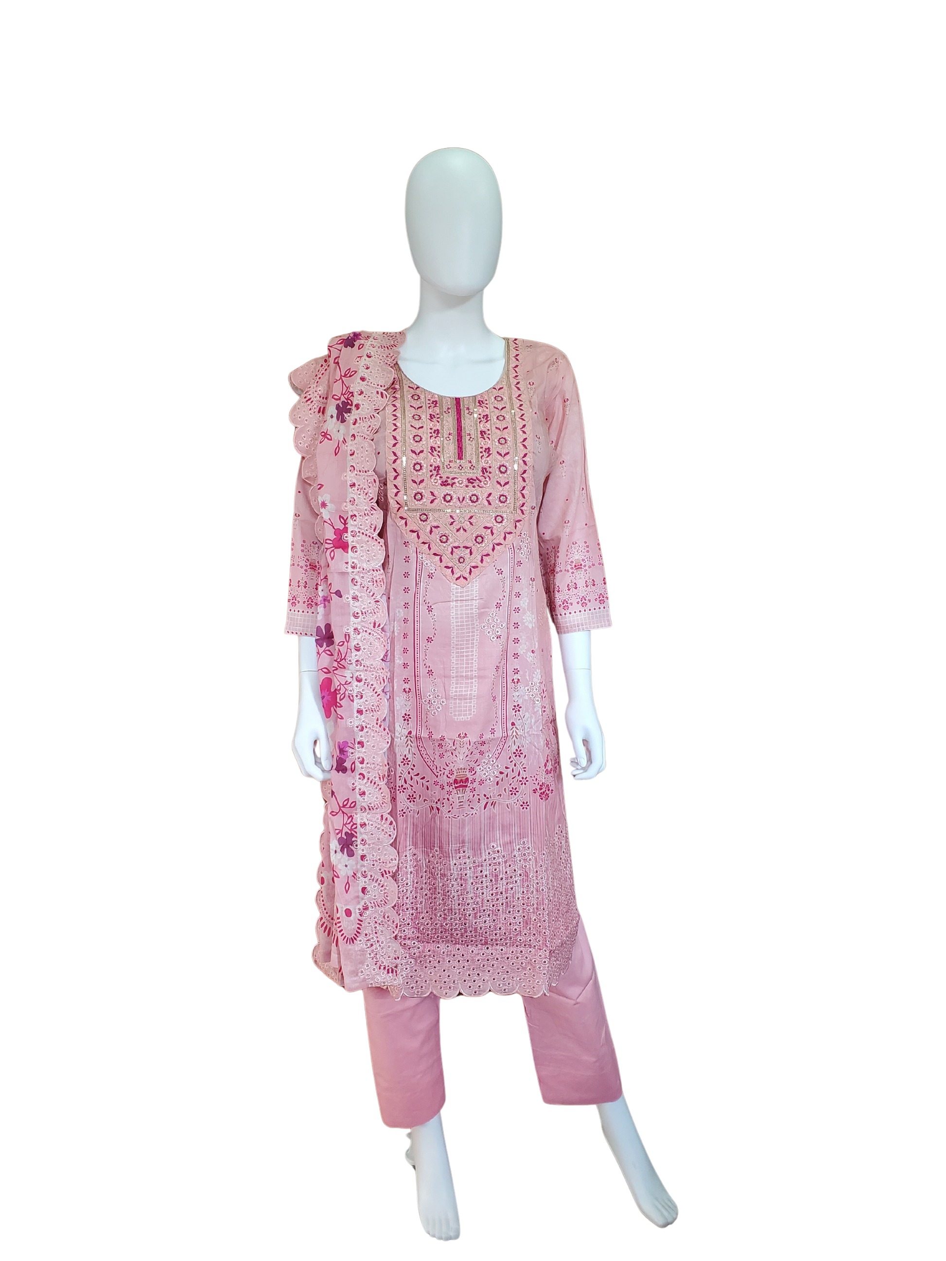 A graceful soft blush pink base enhanced with deeper pink embroidery, creating a delicate yet eye-catching contrast.