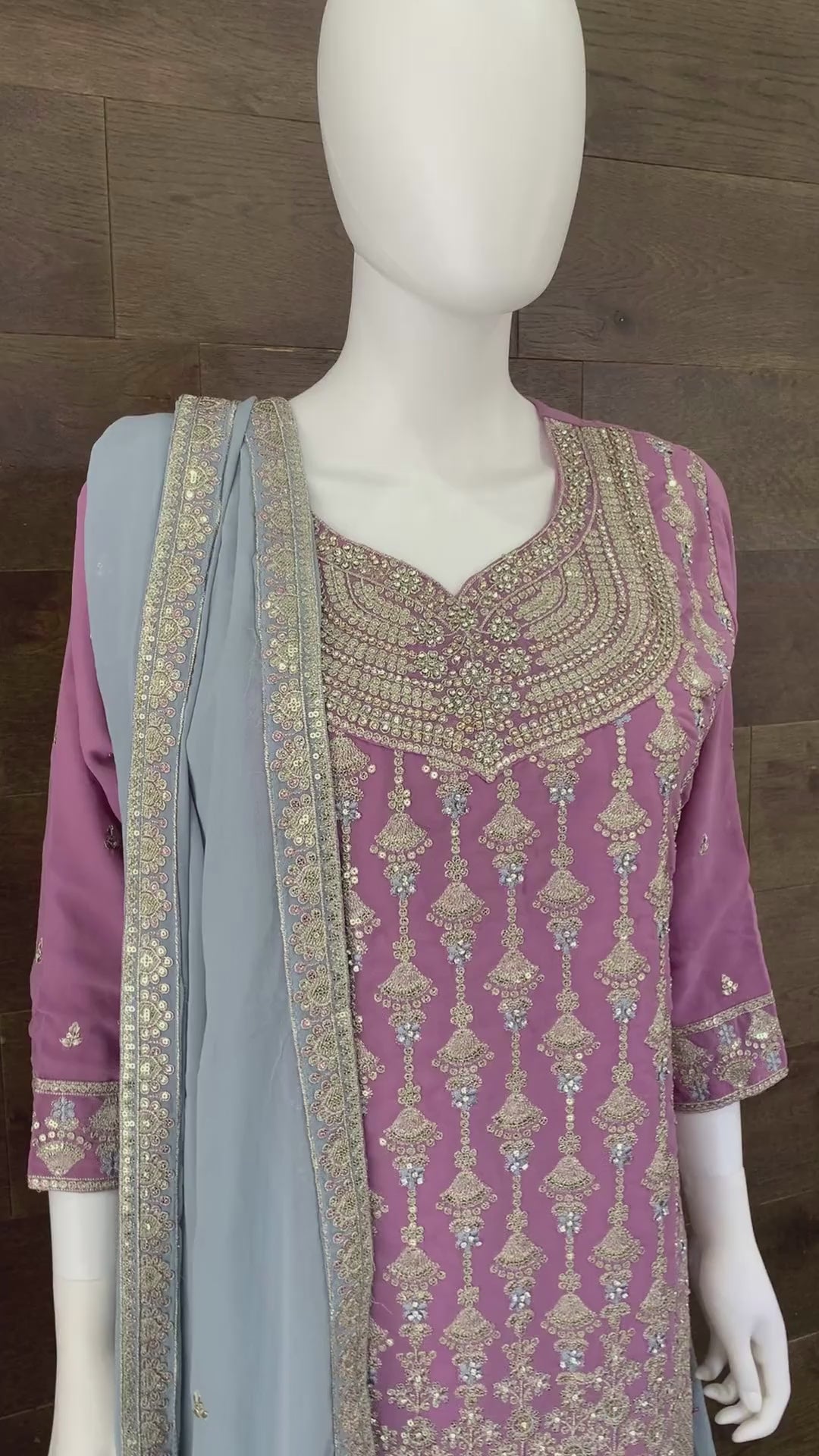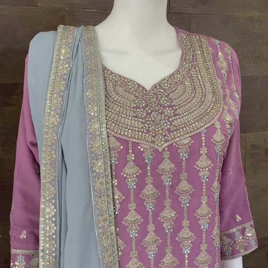 Radiate timeless elegance in this stunning Dusty Rose and Powder Blue Sharara Set, a perfect blend of tradition and modern charm. The outfit features a beautifully hand-embellished dusty rose kameez adorned with intricate sequin and zari work, delicately patterned in vertical motifs that elongate the silhouette.