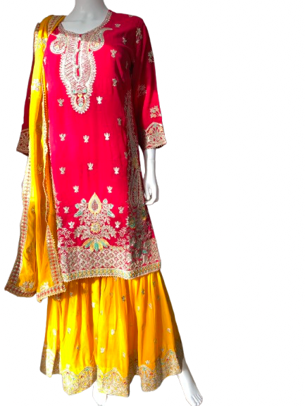 The salwar/sharara is designed in a striking Bright Merigold color, also in soft chiffon, finished with a detailed embroidered border at the hem for added flair. Completing the set is a matching Bright Merigold chiffon dupatta, enhanced with delicate embroidery along the edges for a coordinated and elegant finish.