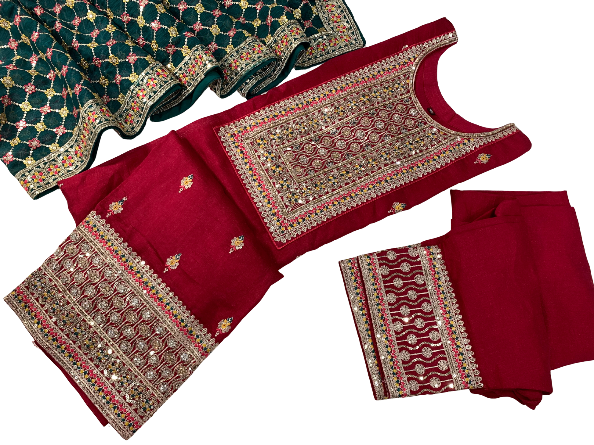 Paired with a stunning contrast dupatta in a deep green shade, designed with an all-over embroidered pattern and decorative border. The dupatta adds richness and completes the ensemble beautifully.